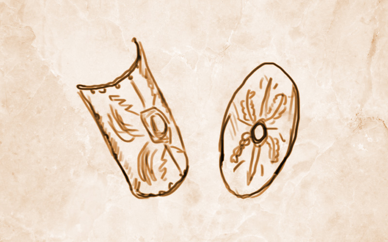 - Rohaut (oder dünnes Messing). Die Länge muss für einmal um den Schild herum reichen. Rohaut lässt sich meterweise auf Mittelaltermärkten besorgen, günstiger ist es aber, wenn man einen Knochen aus Rohaut für Hunde aufweicht und verarbeitet. Beim Einweichen können minderwertige Kauknochen sich auflösen und man hat nur einen Faserbrei. Empfehlenswert ist dieser Riesenkauknochen von Dehner. Er reicht gut für ein Schild.